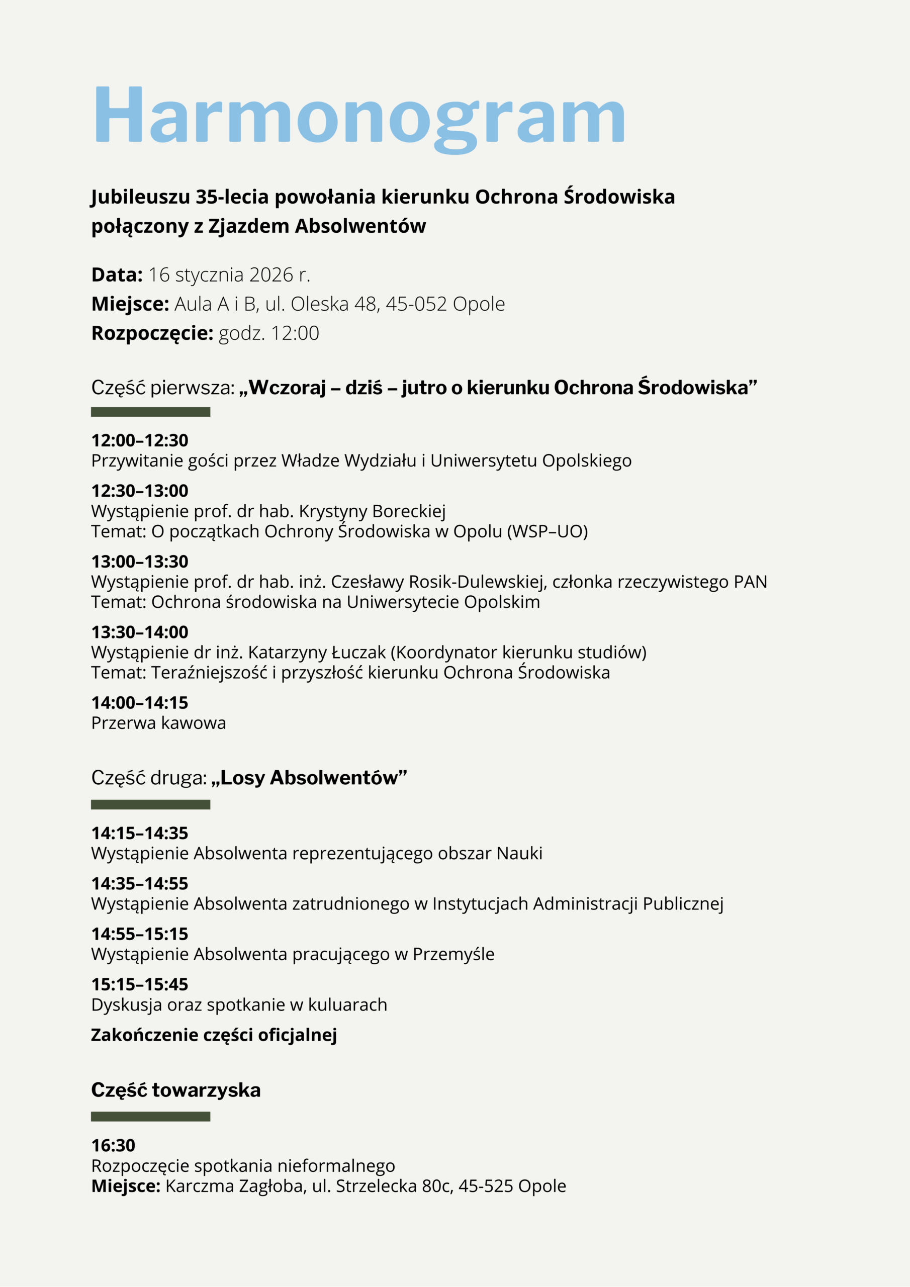 Komitet Organizacyjny Zjazdu Absolwentów kierunku Ochrona Środowiska Uniwersytetu Opolskiego ma zaszczyt zaprosić Państwa na uroczystość z okazji 35-lecia powołania kierunku Ochrona Środowiska.